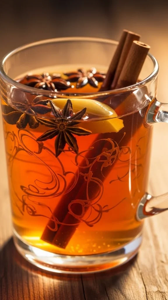 Garnish with star anise. Serve in glass mugs to show spices. Pair with biscuits or bread. Perfect for cozy afternoons. Add apple slices for visual flair.