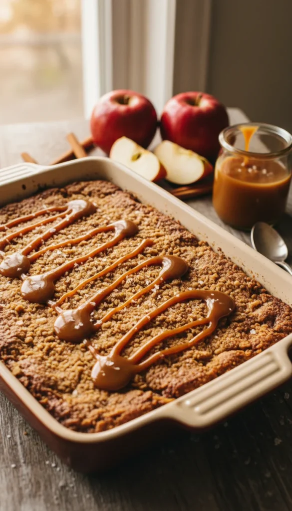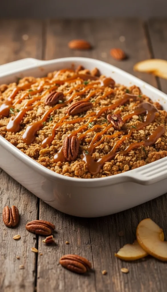 Remove from the oven and immediately drizzle the warm crisp with caramel sauce so it sinks slightly into the topping. Let rest for 10–15 minutes before serving.