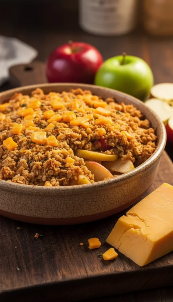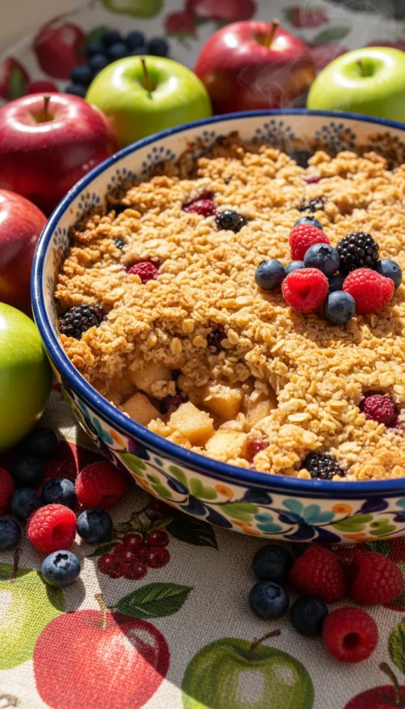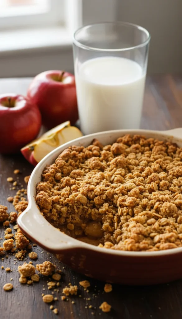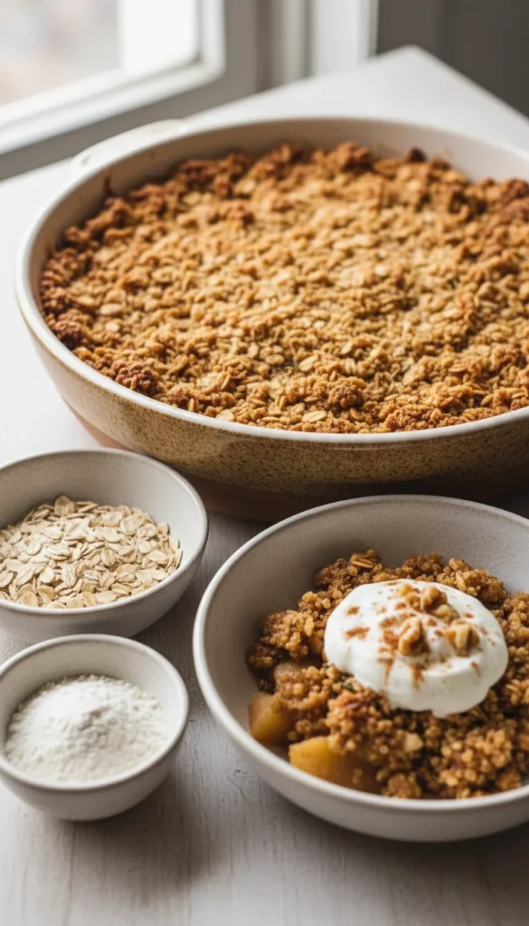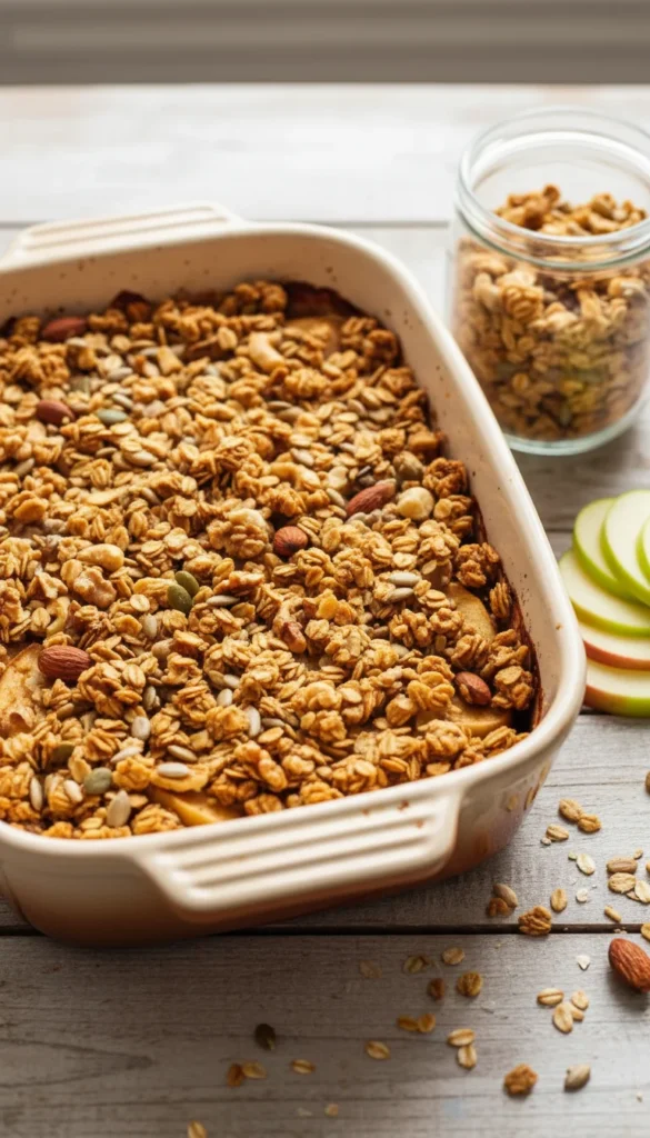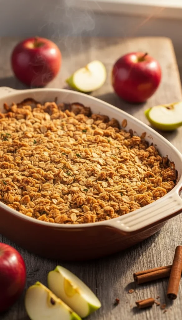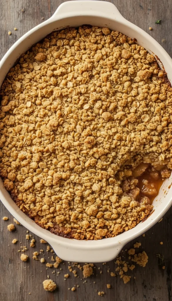 Bake for 40–45 minutes, until the topping is golden and crisp and the apples are bubbling. Let rest for 10–15 minutes before serving.