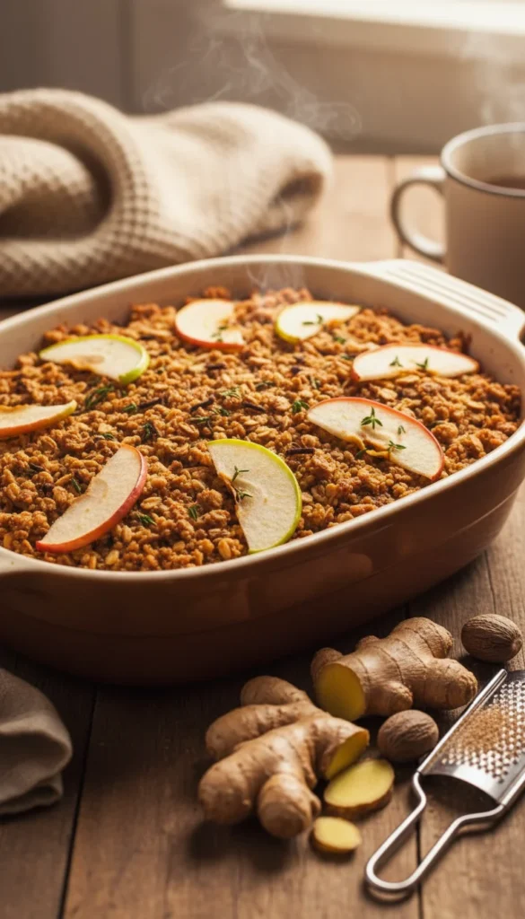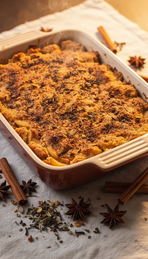 Serve this spiced crisp warm, with vanilla ice cream or a scoop of lightly sweetened whipped cream to balance the spices. A sprinkle of freshly grated nutmeg or a tiny pinch of ground ginger on top of each portion looks lovely and hints at the flavors inside. You can also top with a few thin matchsticks of fresh apple for contrast. It pairs especially well with herbal or chai-style teas, which echo the spiced notes in the dessert. This crisp makes a cozy finish to any fall dinner menu.