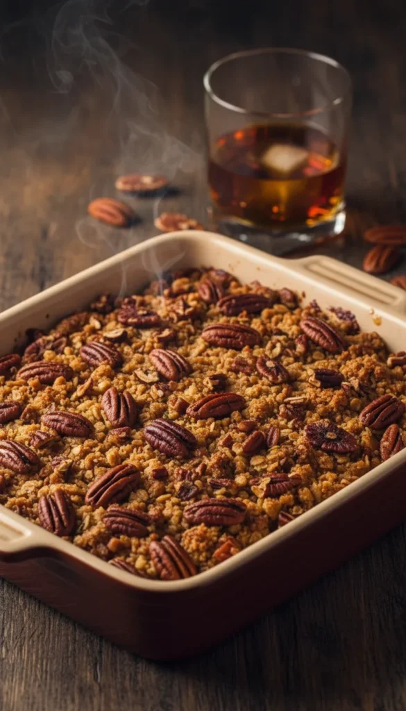 Serve this crisp warm, with vanilla or butter pecan ice cream for a rich finish. A drizzle of caramel sauce or a light splash of cream over the top adds extra indulgence. Garnish with a few whole toasted pecans on each serving for crunch and a polished look. It pairs nicely with coffee or a small glass of bourbon on the side for adults who enjoy it. This dessert is ideal for cooler evenings when you want something cozy with a hint of sophistication.