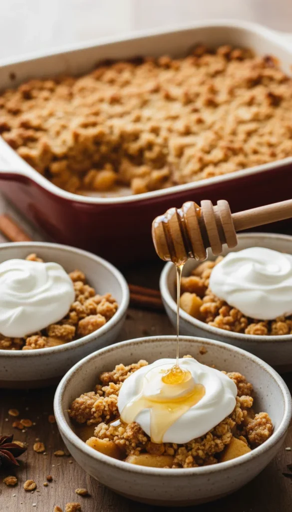Spoon the warm crisp into bowls and top each portion with a generous dollop of Greek yogurt. Drizzle honey over the yogurt so it forms a visible swirl. For a finishing touch, add a sprinkle of cinnamon or a few oat crumbs on top. This version feels right at home on a brunch table or as a lighter dessert after a hearty meal. It pairs nicely with herbal teas or a mild coffee, giving you a sweet ending without feeling too heavy.