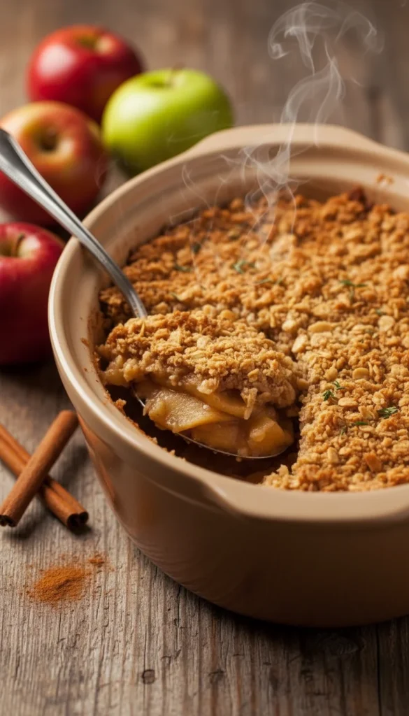 Bake for 35–40 minutes, until the topping is golden and crisp and the apples are bubbling and tender. Let cool for about 10–15 minutes before serving so the juices thicken slightly.