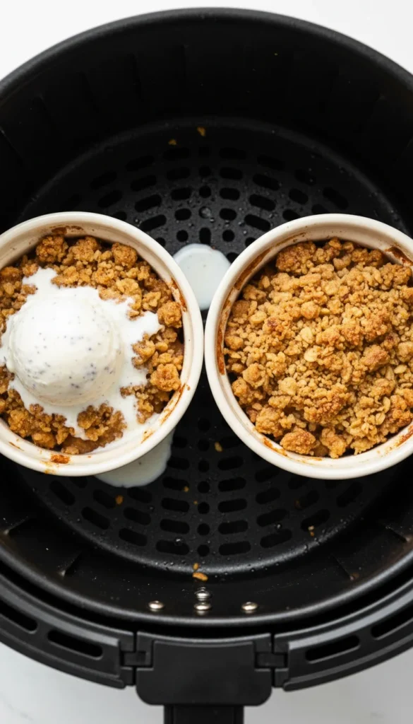 Place the ramekins in the air fryer basket, leaving space around them for air circulation. Cook at 350°F (175°C) for 12–15 minutes, until the topping is golden and crisp and the apples are bubbling. If the top browns too quickly, lower the temperature slightly and cook a few minutes more until the fruit is soft.