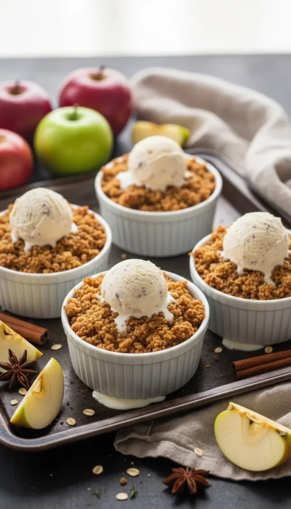 Bring the tray of mini crisps to the table and place one ramekin on each plate, being careful of the hot dishes. Top each with a small scoop of vanilla ice cream or whipped cream so it melts just a bit into the crumble. A sprinkle of cinnamon or a tiny fan of apple slices makes a simple but pretty garnish. You can also drizzle caramel sauce over the top for extra sweetness. These individual crisps pair beautifully with coffee, tea, or hot cider and make any gathering feel a little more special.