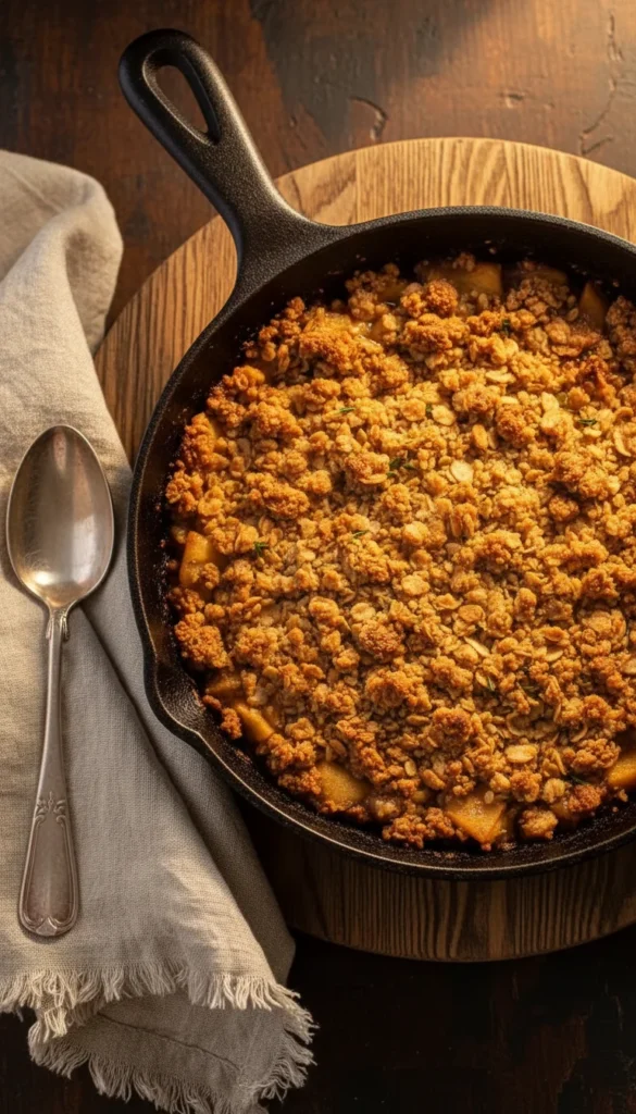 This brown butter skillet apple crisp is made right in a cast-iron pan, where the butter is browned first to bring deep, toasty notes to both the apples and the topping. The brown butter adds a hint of caramel and nuttiness that makes each bite taste richer and more complex. Baking it in the skillet gives the edges extra crispness and keeps everything hot for longer at the table. The oat topping still has that beloved crumble texture, but the flavor is more layered thanks to the browned butter. It is especially fun to bring the skillet straight to the table for everyone to scoop from.