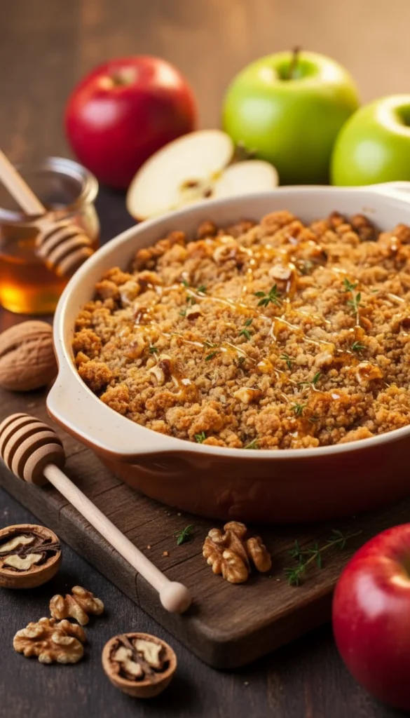 This apple crisp with yogurt and honey swirl is a slightly lighter-feeling version that finishes with creamy yogurt instead of ice cream. The apples and crunchy oat topping are kept classic, but each serving gets a generous spoonful of thick yogurt and a swirl of golden honey on top. The tang of the yogurt balances the sweetness of the apples and crumble, while the honey adds a floral note. It is a dessert that works nicely for brunch or a not-too-heavy evening treat. The combination of warm crisp and cool yogurt is especially satisfying.