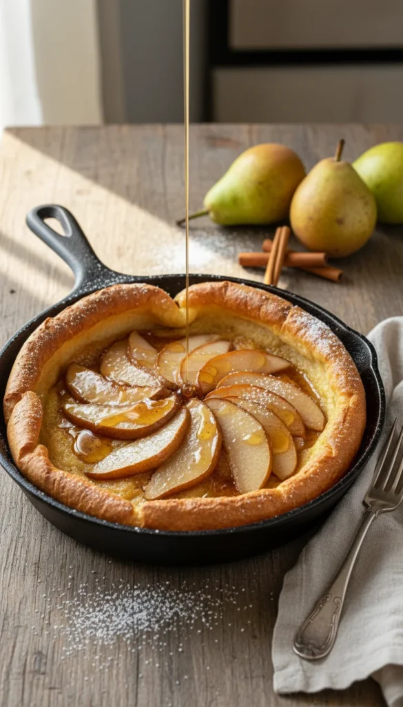 While the Dutch baby bakes, prepare the pear topping: in a skillet over medium heat, melt 2 tbsp butter. Add pear slices, maple syrup, cinnamon, and a pinch of salt. Cook for 6–8 minutes, stirring gently, until pears are tender and glossy. Keep warm on low heat.