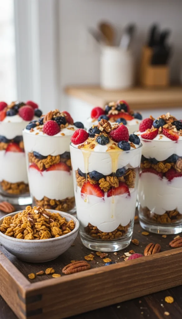 These maple pecan granola parfaits are a light yet satisfying option for an autumn brunch spread. The granola is baked until crisp and fragrant, with maple sweetness and warm cinnamon coating every cluster. Layered with creamy yogurt and fresh fruit, it gives a lovely mix of textures in each spoonful. You can bake the granola days in advance, making morning assembly quick and relaxed. It’s a nice choice for guests who prefer something not too heavy but still comforting.