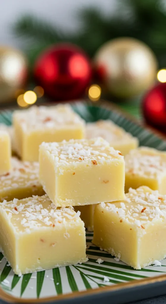 This coconut cream fudge is a tropical-inspired holiday treat with a creamy, dreamy texture. The sweet coconut flavor shines through, making it a unique addition to your festive dessert table.