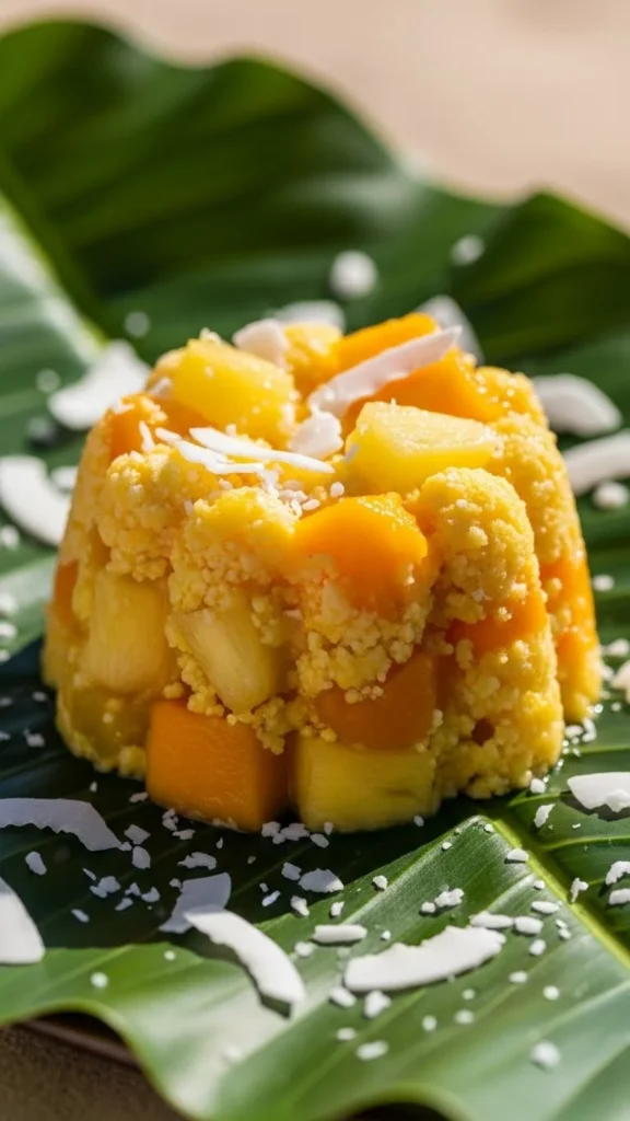 Drizzle coconut milk. Add mango slices. Serve with passionfruit. Garnish with lime. Plate colorfully. Enjoy with piña colada.