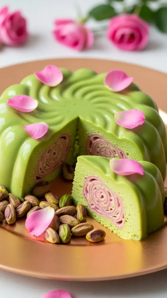 Pistachios and rose water lend a floral, nutty elegance to this pudding, inspired by exotic tales told at family dinners. The green nuts add color and bite, rose softening with perfume. It’s refined and unique, for special occasions. Fruits absorb the essence beautifully.