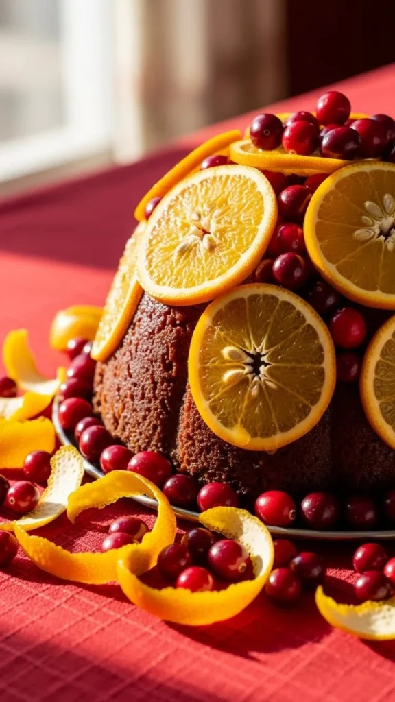 Drizzle with warm brandy sauce for extra indulgence. Garnish with toasted almonds scattered on top. Cut into wedges and serve with clotted cream. Surround with orange slices for citrus freshness. Flame it tableside for dramatic effect. Pair with mulled wine to enhance the spices.