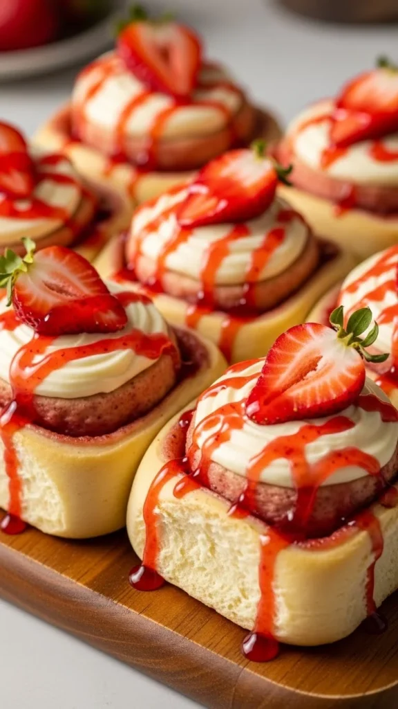 Top with sliced strawberries. Serve chilled or warm depending on your frosting preference. Add powdered sugar for a snowy touch. These work wonderfully as a holiday treat or spring brunch centerpiece.