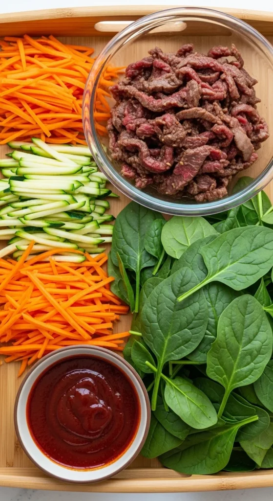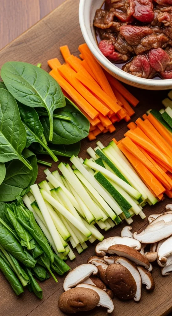 Slice zucchini and carrots into thin matchsticks. Blanche spinach and bean sprouts separately in boiling water for 30 seconds, then shock in cold water, drain, and toss with 1 tsp sesame oil and a pinch of salt each. Slice shiitake mushrooms thinly. For the beef, mix soy sauce, sesame oil, sugar, and garlic in a bowl, add the sliced beef, and marinate for 15 minutes.