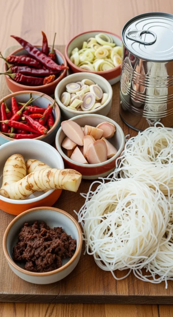 - For the spice paste: 3 dried red chilies (soaked in hot water), 2 fresh red chilies, 1 small onion, 3 garlic cloves, 1-inch piece ginger, 1-inch piece galangal (or extra ginger), 2 lemongrass stalks (white parts only), 1 tbsp shrimp paste, 1 tsp turmeric, 1 tsp ground coriander, 1 tbsp vegetable oil.