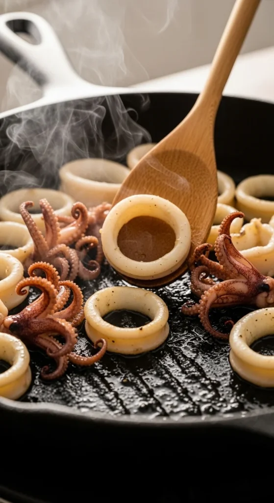 While the risotto finishes, heat 1 tbsp olive oil in a small skillet over high heat. Sear squid rings and tentacles for 1–2 minutes until just opaque and lightly charred. Season with salt and a squeeze of lemon. Set aside.