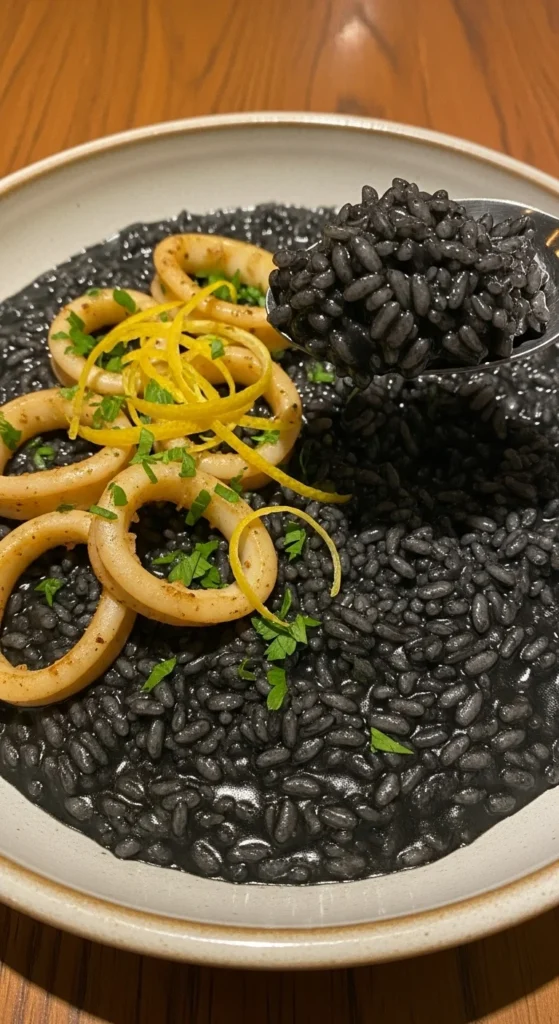Risotto nero (black risotto) gets its color and umami punch from squid ink, a natural ingredient with a subtle seafood sweetness. The creamy Arborio rice absorbs a rich fish stock, while a touch of tomato and garlic rounds out the flavors. It’s a showstopper that’s surprisingly forgiving—perfect for a date night or impressing guests.