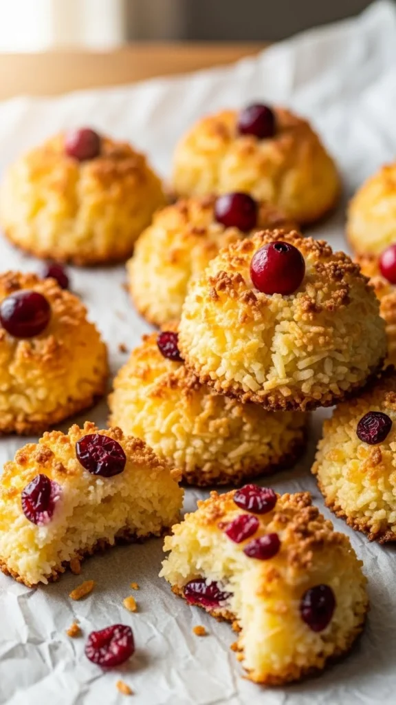 Chewy coconut macaroons get a fruity twist from cranberries. Crisp on the outside and soft inside, they’re easy to make and visually appealing. Ideal for snacks, gifting, or a holiday cookie platter.