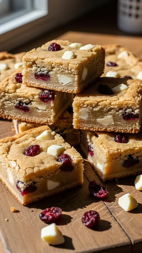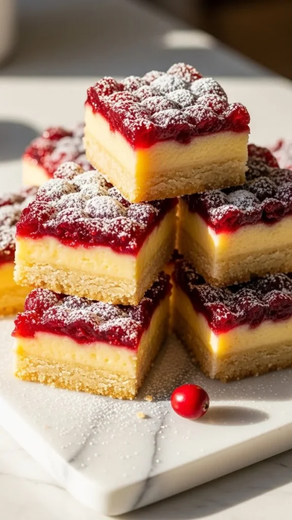 Cool completely, dust with powdered sugar. Slice into bars, garnish with extra cranberries or lemon zest. Serve with tea or coffee. Perfect for picnics, brunches, or dessert tables.