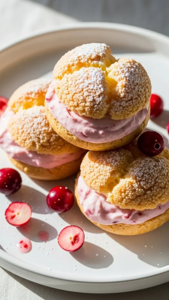 Light and airy cream puffs get a festive twist with cranberry filling. The tart cream balances the delicate pastry perfectly, making these puffs an elegant dessert for parties or special occasions. They are impressive yet simple to serve.