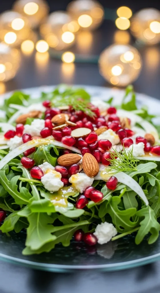 Sharp arugula meets the juicy pop of pomegranate seeds in this salad, where creamy goat cheese and crunchy almonds add layers of texture, making it a bright addition to winter feasts that cuts through richer foods with its tangy lemon dressing and hints of fresh herbs.
