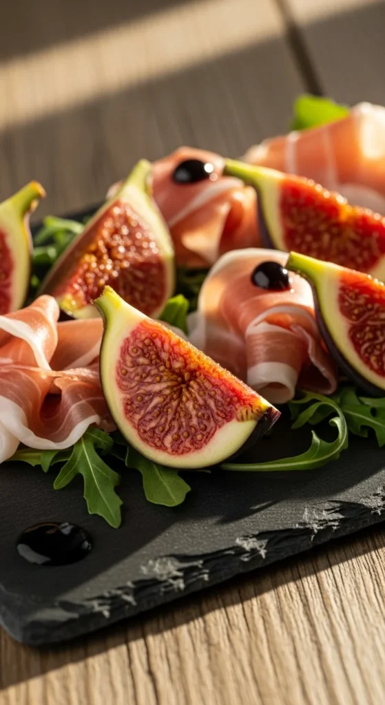 Figs and prosciutto over arugula with balsamic, for a sweet-salty holiday treat.
