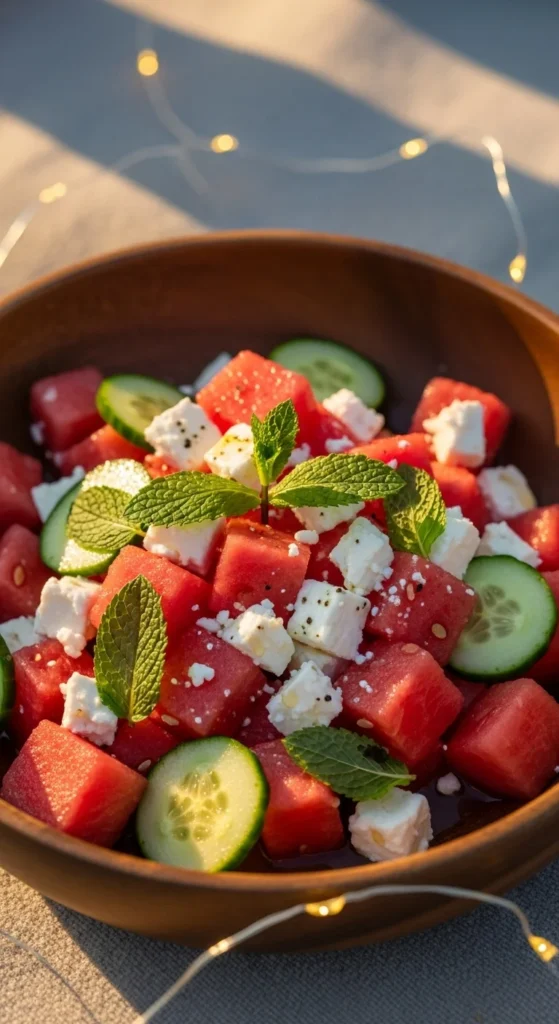 Watermelon cubes with feta and mint, for a cooling holiday salad twist.