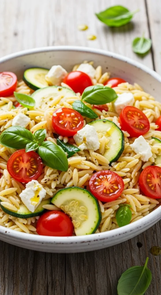 Orzo pasta salad with veggies and feta, for a hearty option.
