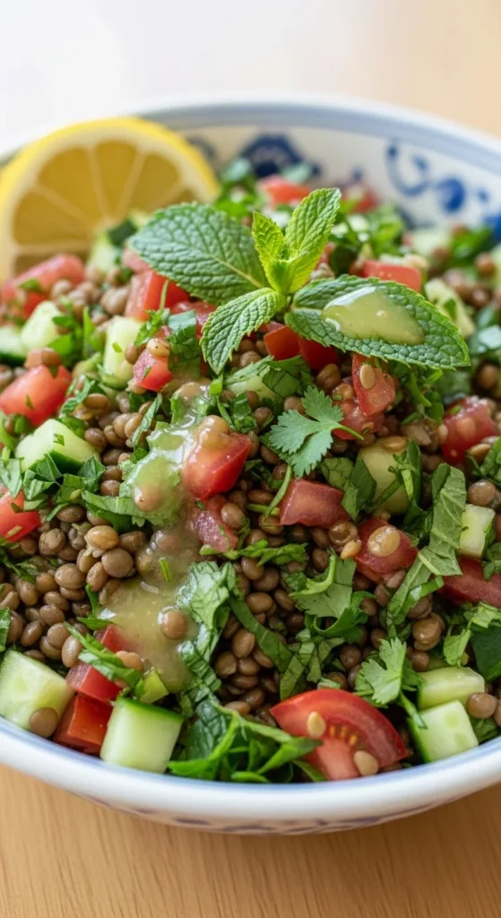 Lentils with herbs and veggies, lemon dressing, for a protein-rich salad.