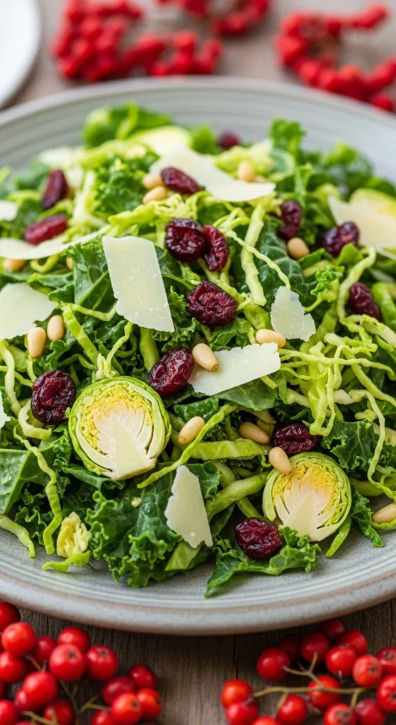 Massaged kale joins thinly sliced Brussels sprouts for a hearty base in this salad, where dried cranberries provide sweetness and pine nuts offer a nutty bite, all brought together by a zesty lemon vinaigrette that makes it a robust choice for cold-weather celebrations.