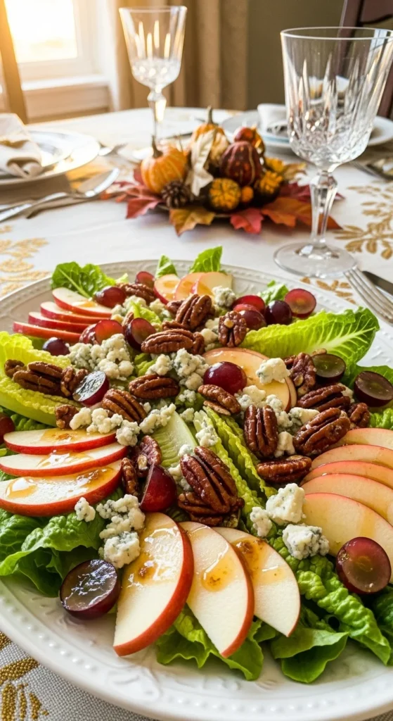 Tart apple slices mingle with candied pecans in this crisp salad over romaine, where blue cheese adds a creamy tang and a cider dressing evokes fall flavors, making it a delightful complement to holiday roasts with its mix of sweet and savory elements.