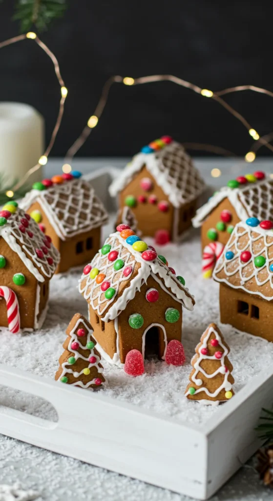 Display these mini houses on a tray dusted with powdered sugar to mimic a snowy village. Serve with hot cocoa for dipping or as part of a dessert charcuterie board. They’re perfect for holiday open houses or as a fun activity for kids to decorate at parties.