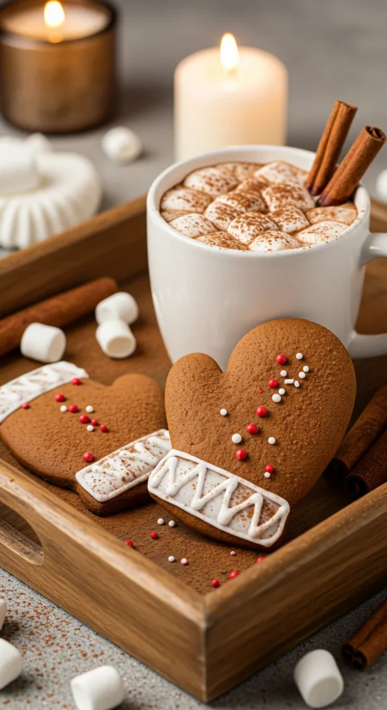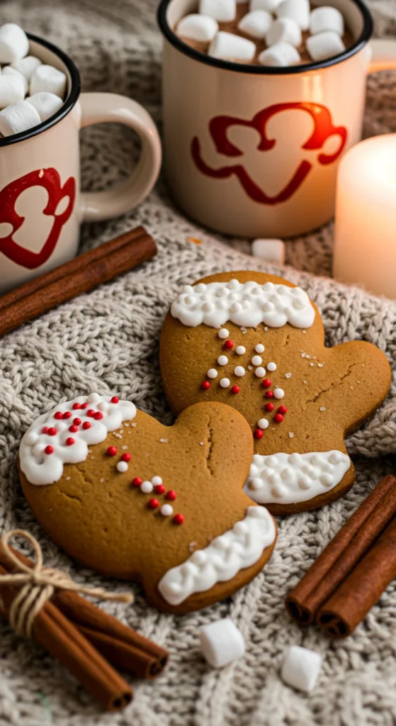 These mitten cookies are designed for dipping in hot cocoa, with a rich gingerbread flavor that pairs perfectly with the chocolatey drink. The cocoa powder dusting adds an extra layer of flavor, making them a cozy treat for chilly holiday evenings.