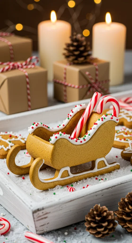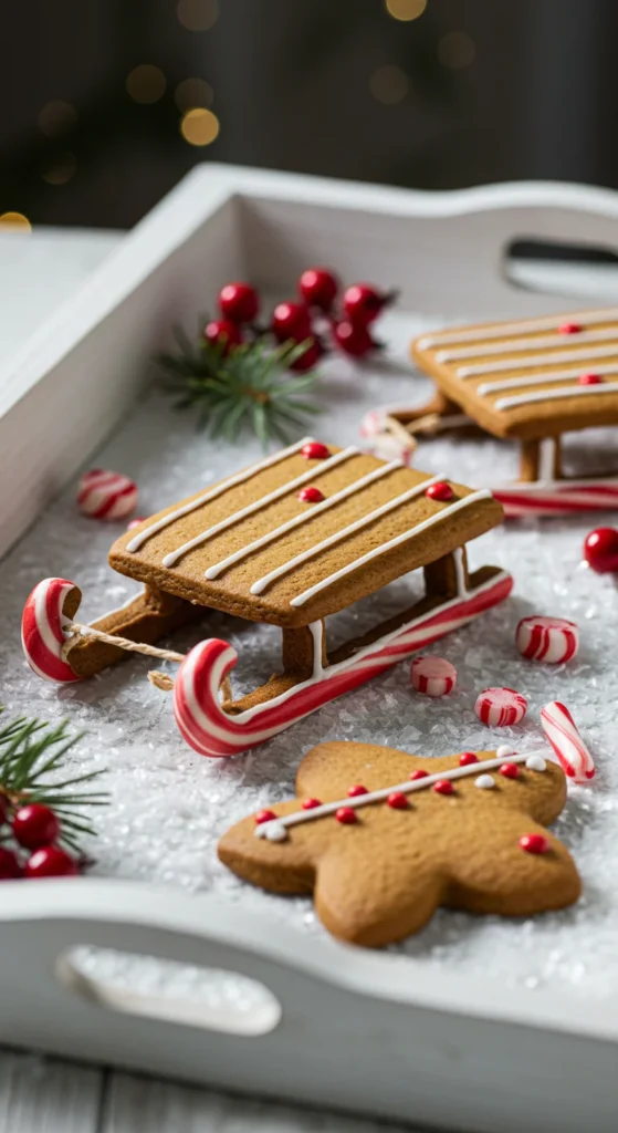 These sleigh-shaped cookies are a playful holiday creation, with candy cane runners adding a minty crunch to the spiced gingerbread. Their whimsical design makes them a hit with kids, while the classic flavors appeal to all, perfect for festive gatherings or as a fun baking project.