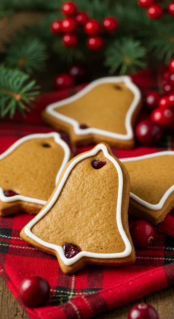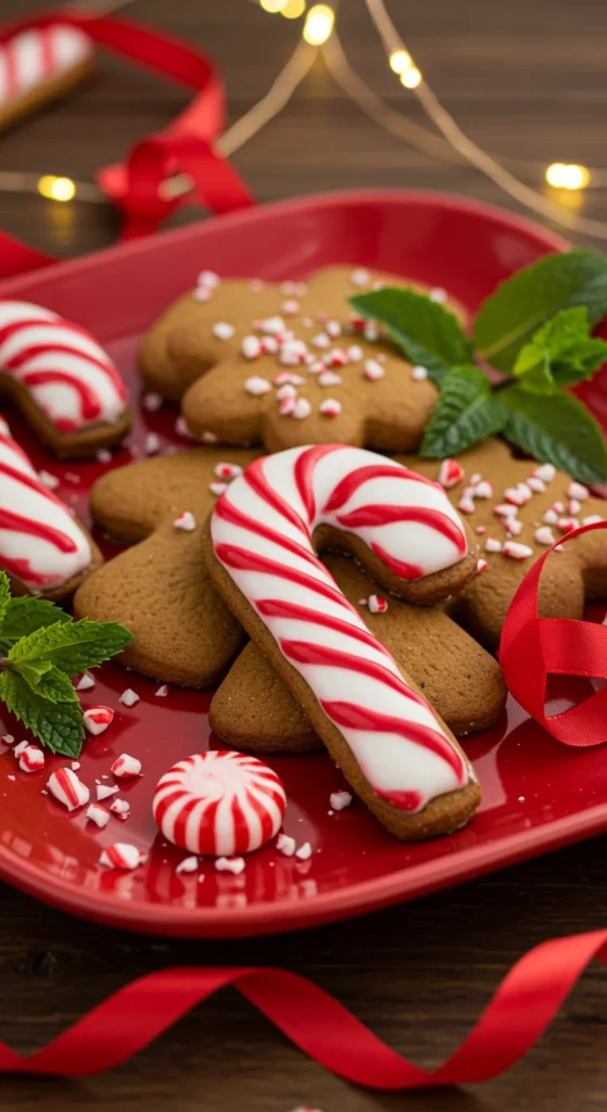These candy cane-shaped cookies capture the iconic holiday treat in gingerbread form, with a bold red and white icing design that’s both festive and flavorful. The spiced dough pairs perfectly with the sweet icing, making them a fun addition to any holiday dessert spread.