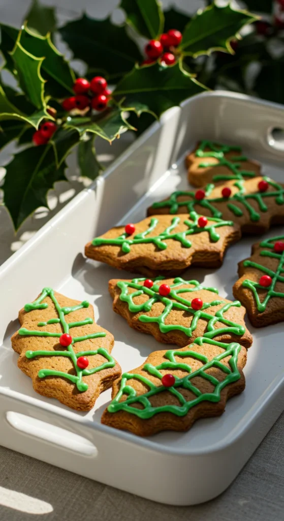 These holly leaf cookies are a sophisticated take on gingerbread, with vibrant green icing and red sugar pearls that mimic the classic holiday plant. Their crisp texture and warm spices make them a perfect balance of festive flair and traditional flavor, ideal for holiday gatherings.