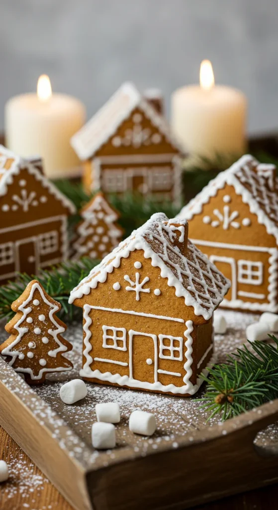 These cabin-shaped cookies evoke a cozy winter retreat, with a dusting of powdered sugar that mimics fresh snow. The warm gingerbread flavor and simple icing make them a charming addition to any holiday table, perfect for creating a winter village vibe.