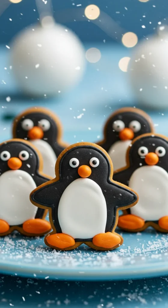 - Mix powdered sugar, milk, and black/orange food coloring for icing; pipe penguin details. Add sugar pearls for eyes.