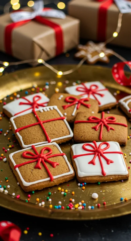 These gift box-shaped cookies are a festive way to share the holiday spirit, with intricate icing bows that make them look like tiny presents. The spiced gingerbread is a perfect base for the sweet icing, making them a delightful treat for gifting or party displays.