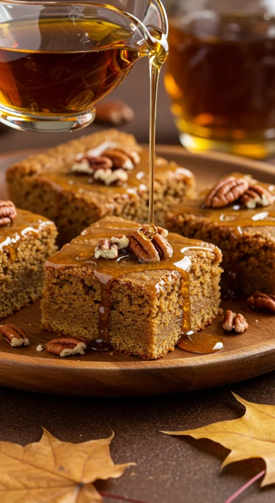 - Mix powdered sugar and maple syrup for glaze; drizzle over squares. Top with pecans.