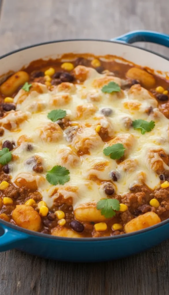 Creamy taco-inspired gnocchi skillet fuses gnocchi night with the flavors of taco Tuesday in one fun, family-style dish. Ground beef, taco seasoning, black beans, and corn mingle with gnocchi in a silky, cheesy sauce. The result is hearty and comforting, with familiar spices and plenty of texture. A topping of melted cheese and fresh cilantro makes it bright and inviting. It’s an easy way to shake up your usual gnocchi routine.