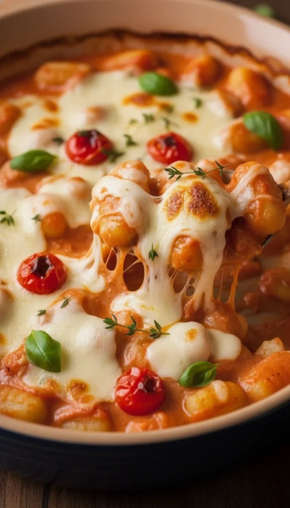 Creamy caprese gnocchi bake takes the beloved trio of tomatoes, mozzarella, and basil and turns it into a bubbly, comforting casserole. Gnocchi bake in a light tomato cream sauce that becomes silky and rich, while fresh mozzarella melts into gooey pockets. Cherry tomatoes burst with sweetness, and basil brings a fragrant, fresh finish. It’s colorful, cozy, and perfect when you want a dish that feels both comforting and fresh.