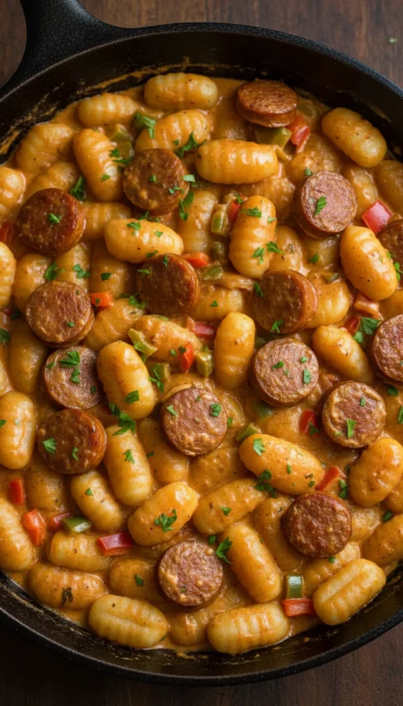 Creamy Cajun sausage gnocchi brings bold, smoky spice to your gnocchi night, with sliced sausage, peppers, and a gently spiced cream sauce that clings to every bite. The Cajun seasoning adds warmth without overwhelming the dish, while bell peppers give sweetness and color. The gnocchi cook right in the sauce after boiling, soaking up all the flavor from the sausage and spices. It’s a one-pan dinner that feels lively and comforting at the same time.