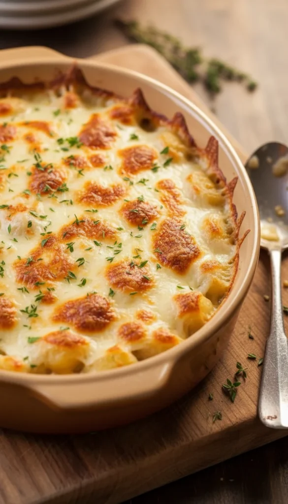 Serve generous spoonfuls of this gratin with a simple green salad or roasted vegetables to balance the rich cheeses. Garnish each portion with chopped basil or parsley for freshness and a splash of color. A squeeze of lemon over the top right before eating gives a bright contrast to the creamy sauce. This dish works well as the star of the table alongside crusty bread or as a side for roasted chicken. Leftovers reheat nicely in a small baking dish or skillet with a splash of cream.
