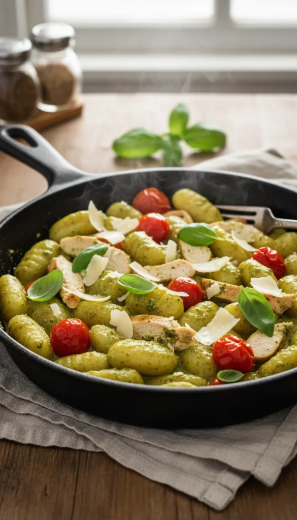 Creamy pesto chicken gnocchi combines juicy bites of seared chicken with fluffy gnocchi and a vibrant basil pesto sauce softened with cream for a silky finish. The sauce clings to the gnocchi and chicken, bringing fresh herb flavor in every forkful without being too heavy. Sweet cherry tomatoes and Parmesan add color and a touch of brightness, making the dish feel both comforting and lively. It comes together in one pan with simple ingredients, perfect for busy weeknights when you still want something that feels special.