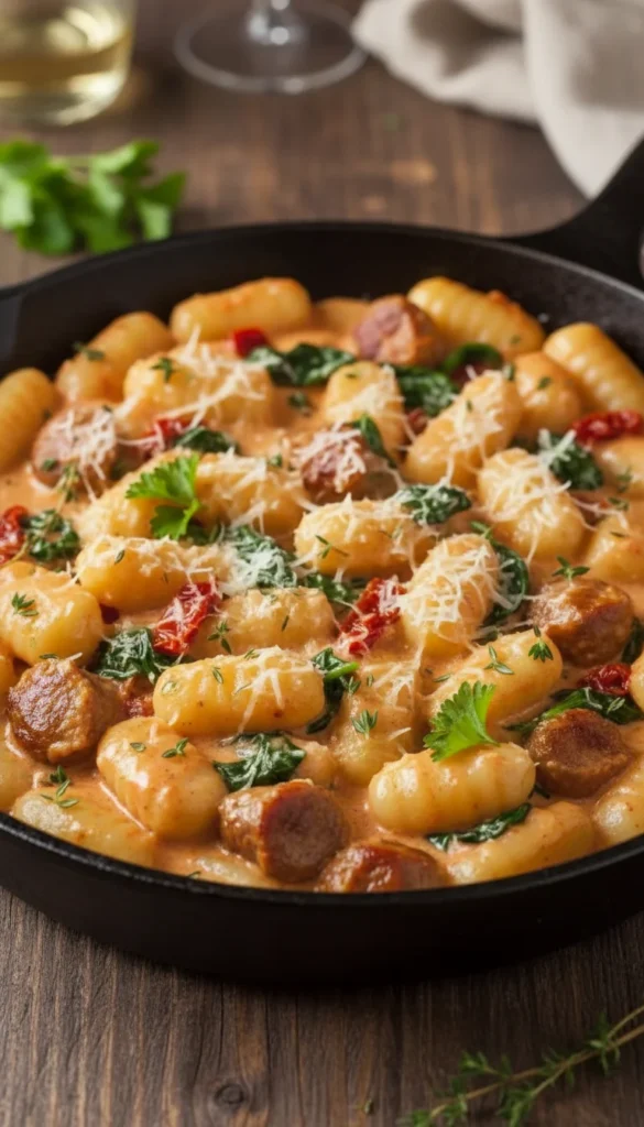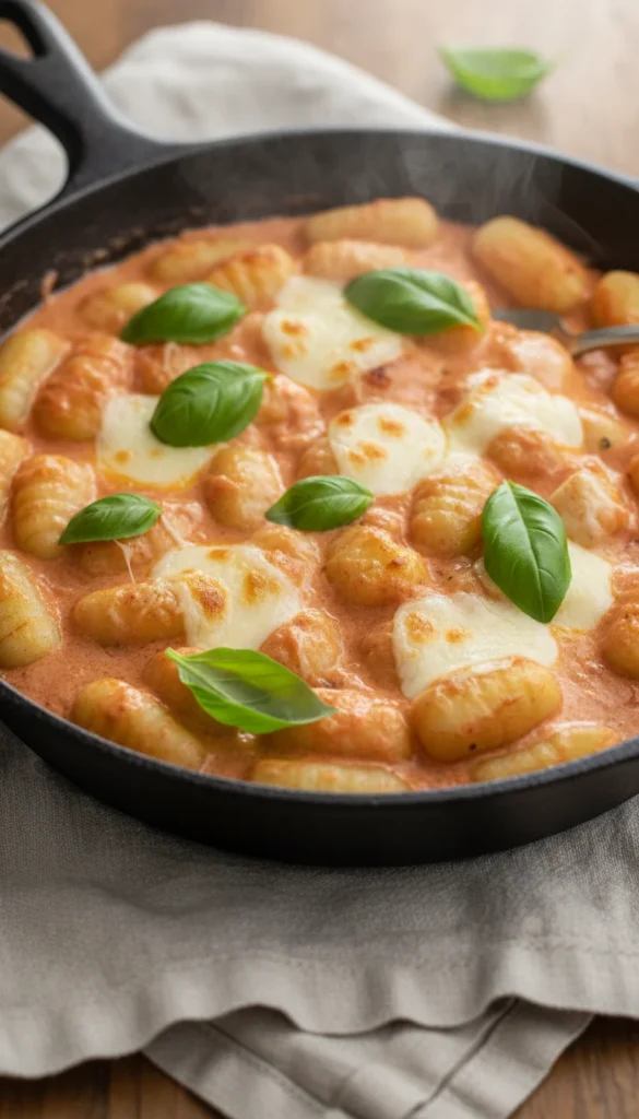 Creamy tomato basil skillet gnocchi turns pantry staples into a cozy, restaurant-worthy meal, with pillowy gnocchi simmered in a velvety tomato sauce enriched with cream and cheese. The sauce has a gentle tang from the tomatoes balanced by sweetness from sautéed onions and aromatic garlic. Fresh basil brings a burst of herb flavor and fragrance that makes the whole kitchen smell amazing. With everything cooked in one skillet and finished in the oven, cleanup stays simple while flavor stays big.