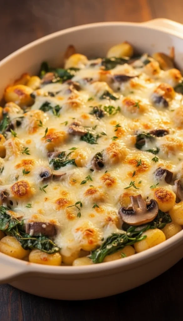 Spinach and mushroom creamy gnocchi bake is a hearty, vegetable-packed dish that still feels indulgent thanks to its rich, garlicky sauce and cheesy top. Earthy mushrooms and tender spinach mingle with gnocchi in a silky cream sauce that bakes until bubbling and golden around the edges. It’s a great way to tuck extra greens into a comforting meal without sacrificing flavor. The textures of soft gnocchi, tender vegetables, and melted cheese make every bite satisfying and cozy.