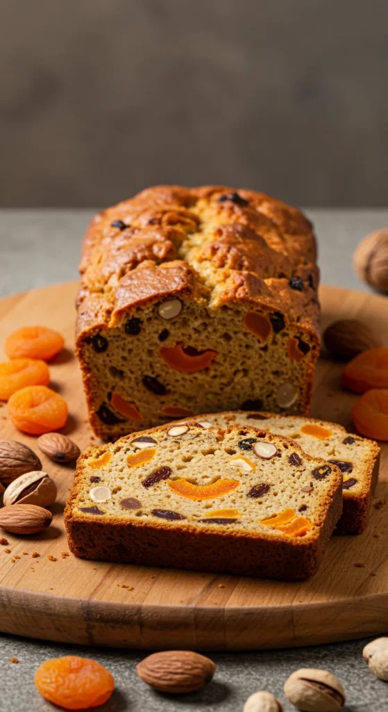 This hearty bread is packed with dried fruit and nuts, spiced with cinnamon and nutmeg for a warm holiday flavor. Its chewy texture and natural sweetness make it a versatile addition to breakfast or dessert spreads.