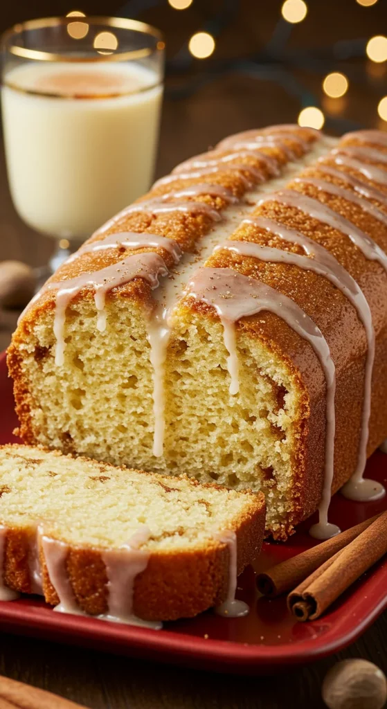 Serve sliced with a dusting of nutmeg for extra holiday cheer. Pair with a glass of eggnog or coffee for a festive treat. The glaze adds a glossy finish, making it perfect for gifting in a decorative box or tin.